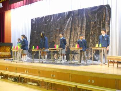 今年も楽しい送る会が始まりました。くす玉割,記念品贈呈に続いて,生徒会本部の出し物です。
