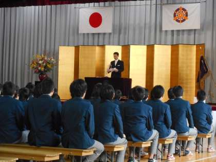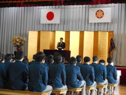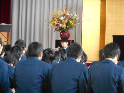 学校長の式辞に続き,来賓を代表してPTA会長細見氏より祝辞を賜りました。生徒代表の送辞は生徒会より2年生の小西君です。