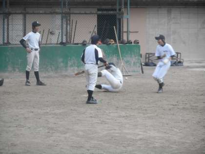 野球部は試合に即した,ホームベース上でのクロスプレーを想定した練習を行っていました。
