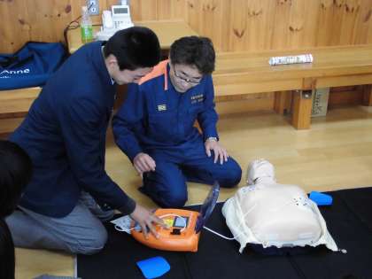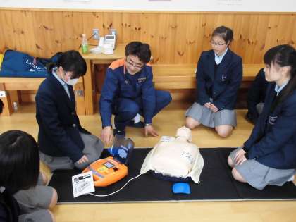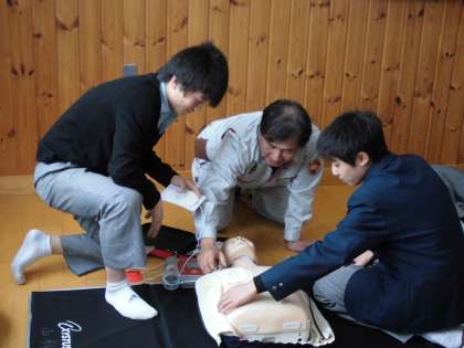 子どもたちも実際にAEDの装置を使って講習を受けています。