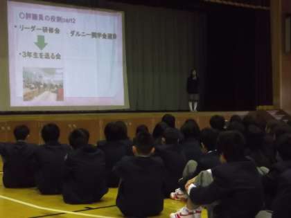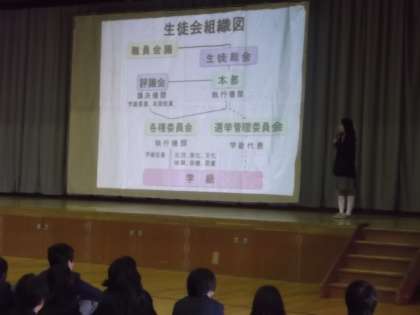 引き続き,生徒会によるオリエンテーションが行われ,生徒会の組織の仕組みや,各委員会の活動について,プロジェクターに映しながら説明してくれました。