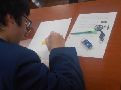 しっかり観察できたら,シートに花びらの絵を写します。タンポポの綿毛になるのはどの部分なのか?楽しくイラストを描いた後、先生の説明が続きます。