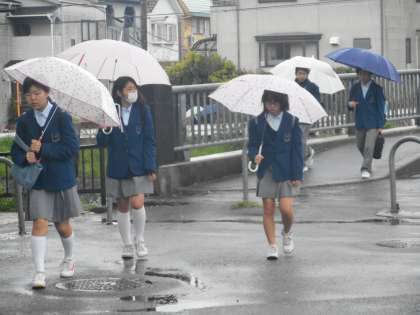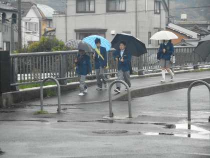今日も雨の朝となり,恨めしそうに空を見上げる生徒もいます。