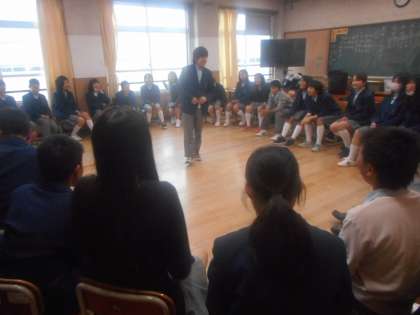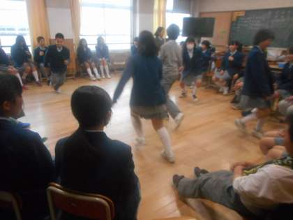 今日は学級の時間に生徒会の委員決めが行われています。2年2組の下飼学級に行くと,すでに委員や係が全部決まっていて,クラスで楽しくレクレーションの最中でした。