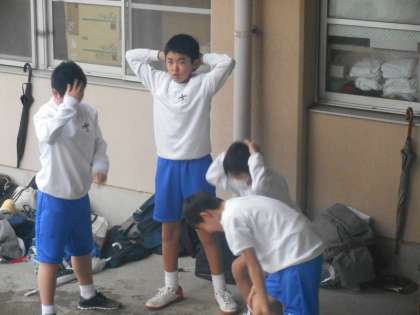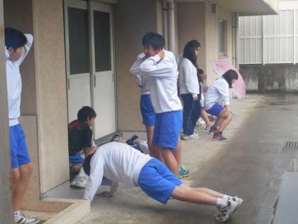 卓球部は今日は体育館の割り当てがなく,雨で中庭も走れないので,体育館の周りの狭いところでトレーニングです。