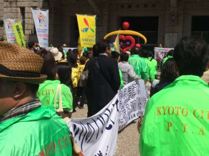 18日(土)憲法月間の取り組みである人権啓発パレードにPTA本部の森川さんと参加してきました。市役所前で集会を開いた後,河原町通りを仏光寺通りの総合教育センターまで,シュプレヒコールをしながら歩きます。