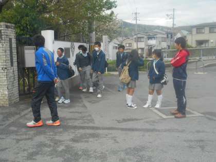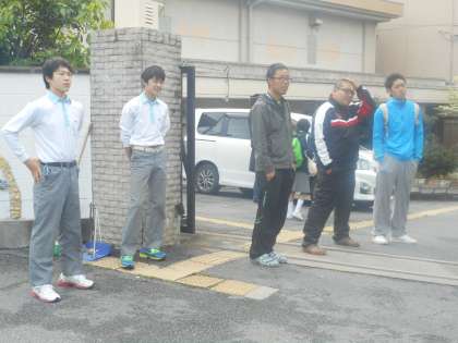 今日は生活委員会のあいさつ運動です。生活委員長,副委員長を中心に,担当の先生方も出てきてくださっています。