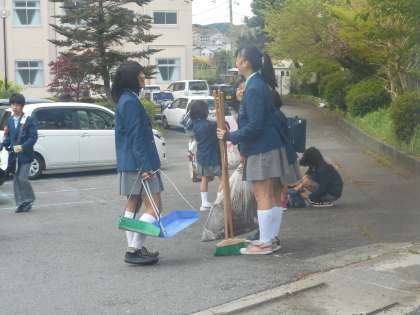 今朝も女子バレー部,陸上部の生徒が,校門付近や玄関付近を掃除してくれています。