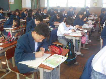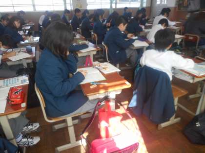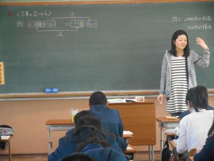 1年3組の数学は中玉利先生です。今日は,正の数負の数について,生活の場面でのいろいろな事例を使って,わかりやすく学習しています。