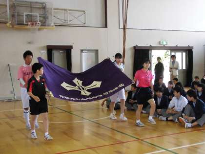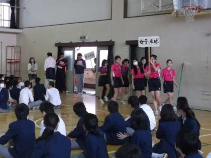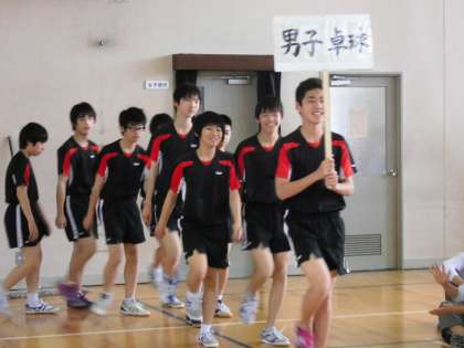 春季総合体育大会の壮行会が行われ,生徒会期を先頭に,キャプテンがプラカードを持ち(サッカー部はキャプテンが選手宣誓を行うため副キャプテン)男子卓球部,昨年度3位の女子卓球部と続きます。