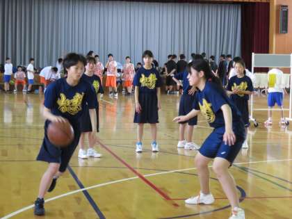 体育館では男女バスケット部が練習です。1年生は両サイドを使ってシュートの練習をしています。中央では2・3年生の練習です。