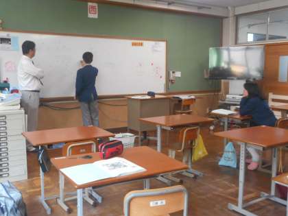 8組のB教室では石井先生による図形の移動の学習,A教室では下飼先生の三角形,四角形,五角形から多角形までの学習をしています。