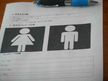 1年生では男女の平等をテーマに考えます。1組では校長講話の内容をおさらいした後,トイレのマークに色を塗ることから始めています。