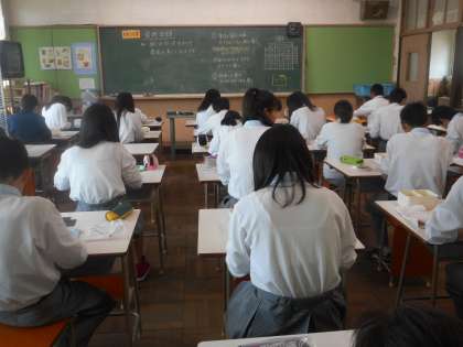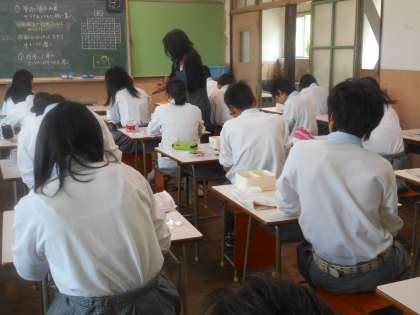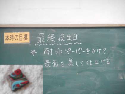 2年生は何やら綺麗な作品を磨いています。今日が完成日と黒板にあったので,できあがりに近づいているようです。何を作っているのか聴くと「うるしの固まったものを削ってる,なにかは分からないけど削ると中から色が出てくる」ということでしたが????