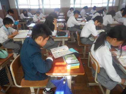 教科書を使って英語のリピートから始まりました。今日は,学生ボランティアの松浦先生も授業の支援に来てくださっています。