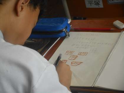 1年1組のようすです。今日は「レタリング」の練習で,正方形・長方形(縦横)・平行四辺形・台形などの形にはめて文字を書く練習をしています