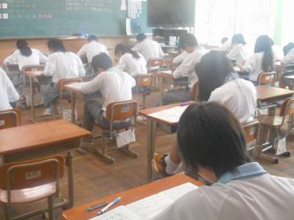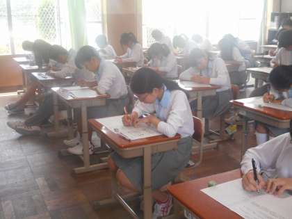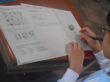 3年7組の英語のテストのようすです。リスニングテストを真剣に聞き取っています。