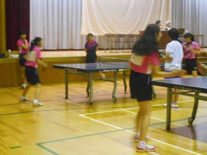 体育館では卓球部が滋賀県や兵庫県の中学校をたくさん招待して,まるで公式戦のような雰囲気で練習試合を行っていました。女子は強敵と当たっているようで,接戦が続いています。