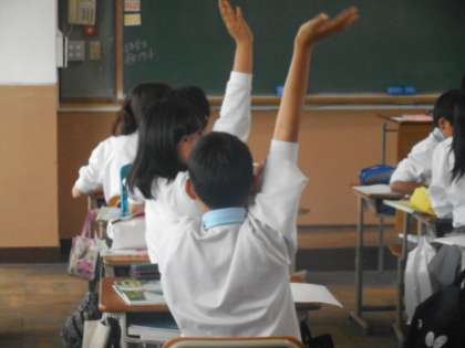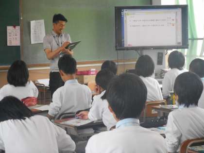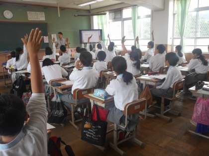 3組の英語の授業のようすです。「誰かできる人」の問いかけにたくさんの生徒が元気に手を挙げていました。