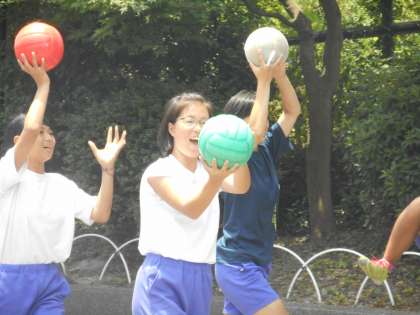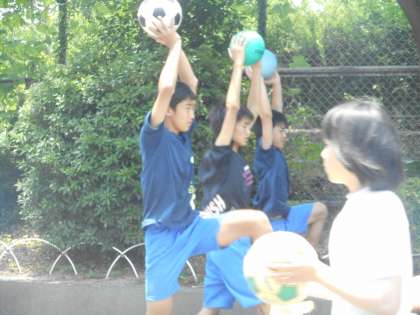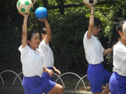 両手の次は片手で掲げますが,更に難しそうで,ボールをこぼしてしまいます。