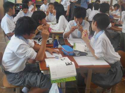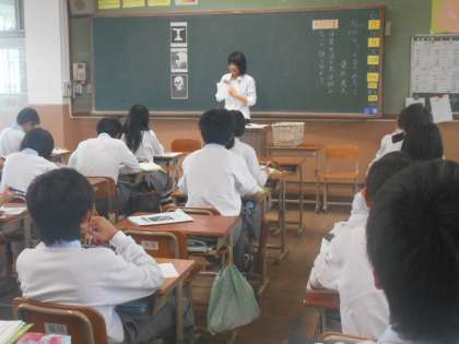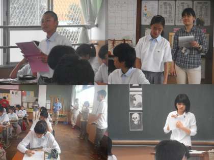 1年生の研究授業は,1年2組で福島先生の国語の授業です。テーマは「ちょっと立ち止まって」という,見方によって変わる絵を参考にして考えるところです。