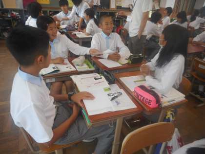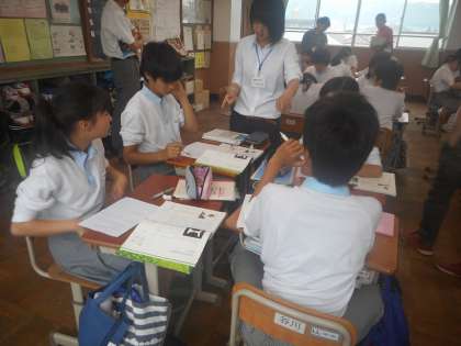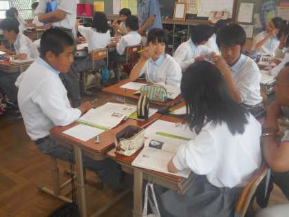 どのグループも活発に話し合っています。個人で考えていたときは,なかなか自分の意見が書けなかった人も,グループで話し合い、そのなかで聞いた友だちの意見を元に書き始めたりもしています。