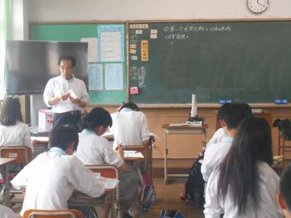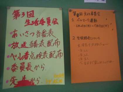 社会科の授業と隣の階段には各種委員会の報告が掲示されています。