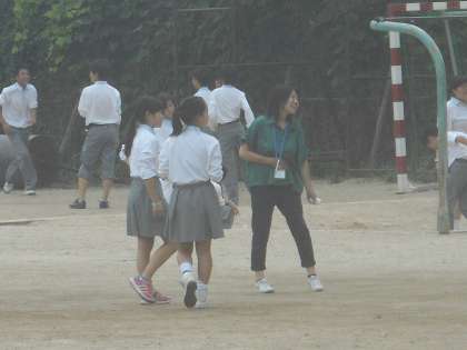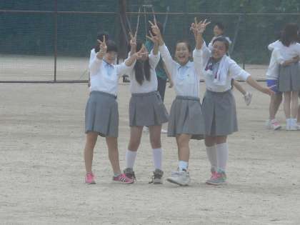 1年生の女子は,英語の幸脇先生と一緒に鬼ごっこでしょうか?こちらに気付いてポーズを取ってくれる生徒も。