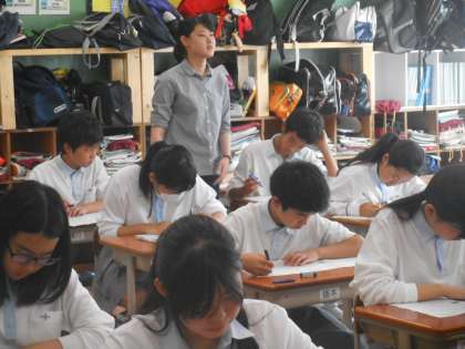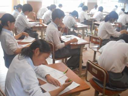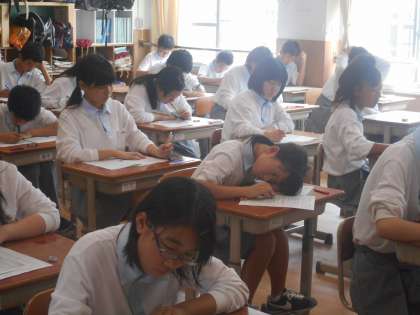 2年生の2時間目は英語のテストです。先生が回ってこられると,質問の手がよく挙がっています。