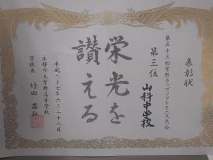 テニス部は6月28日、30数校が参加して,市立紫野高校で行われた「第53回紫野カップ」で,堂々3位に入賞しました。この勢いで夏季大会も頑張ってください。