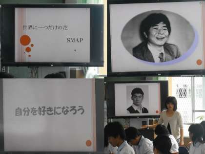 1年生は「自己を見つめる」というテーマで,「世界に一つだけの花」という有名な曲や登山家で冒険家でもある野口健さんや植村直己さんの資料を使って行われました。