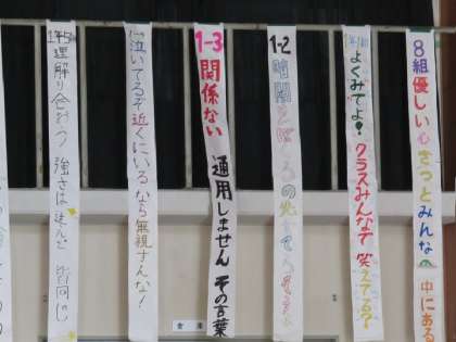 1年生の学級発表と各クラスのいじめ追放標語です。