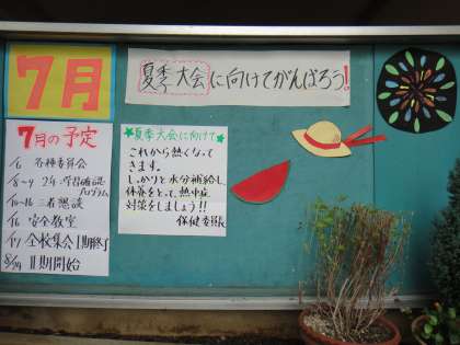 7月から生徒会本部が,校門から玄関までにある黒板に