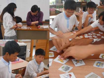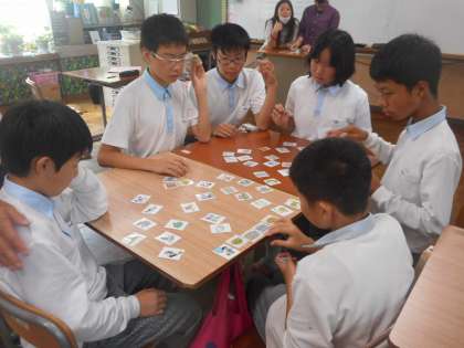 英語の時間では,生徒の一人が単語を読み上げ,他の生徒はその単語が表す絵のカードを取りあいます。楽しく学習できています。