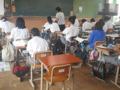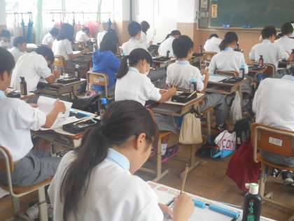 今日の国語は毛筆の時間です。学校名や自分の名前を小筆(細筆)を使って書く練習をしています。字の大きさや書き出しの位置などバランスも難しいようです。