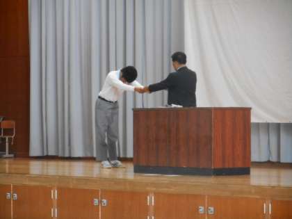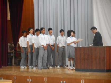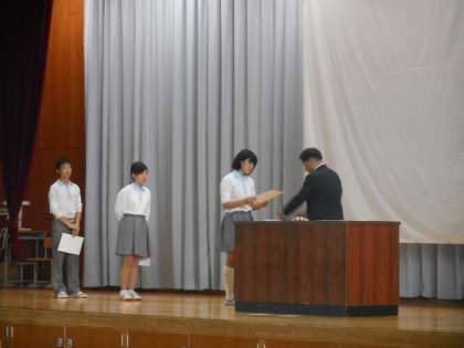 この後、陸上部の入賞(100M高田君と1500M米山)と府大会出場が紹介され,続いて山科中学校区地生連標語の入選発表,よい歯の表彰(全部で28名,代表者は3−1小野君)。美化コンクールと続きます。