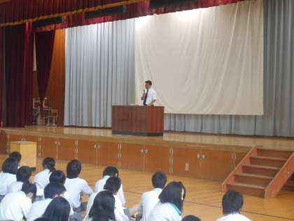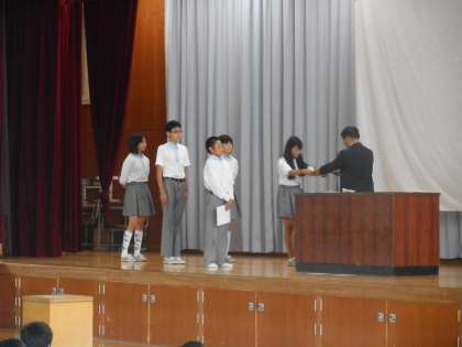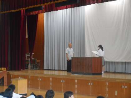 表彰の最後はベル着点検です。この後管理用務員の森田さんに生徒会から感謝状が贈呈されました。生徒会長の話の後、学校長から1期を振り返ってと夏休みに頑張って欲しいことなどが話されました。