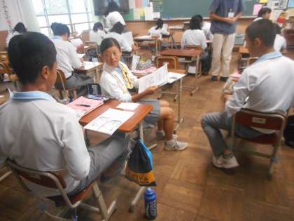 夏休みの宿題レポートについて,過去の作品を見せながら説明しています。先生の説明が終わった後、各班ごとに見本が回され,一人一人が手に取って見ていました。