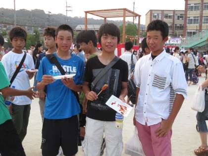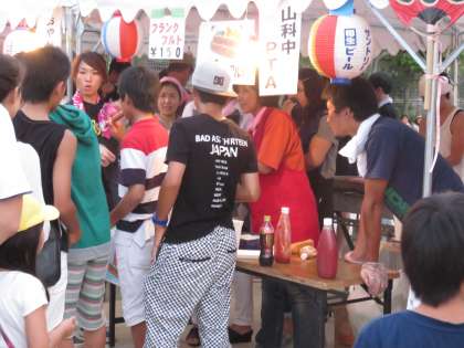 PTAの出店も賑わってきました。笠嶋先生、太田先生も暑い中店先で頑張ってくれてます。お陰で売り上げも上がります。