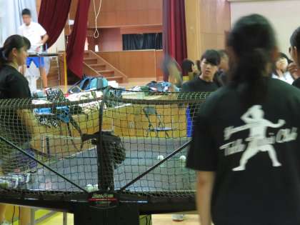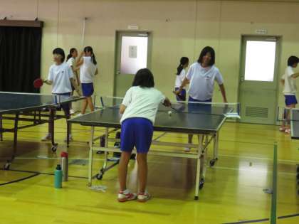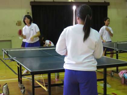 卓球のボールに風の影響が出ないように体育館を締め切って練習していますから,体育館の中は相当蒸し暑いです。卓球台の側にはペットボトルが欠かせません。
