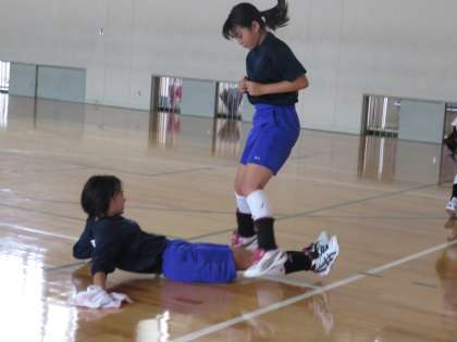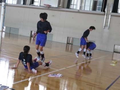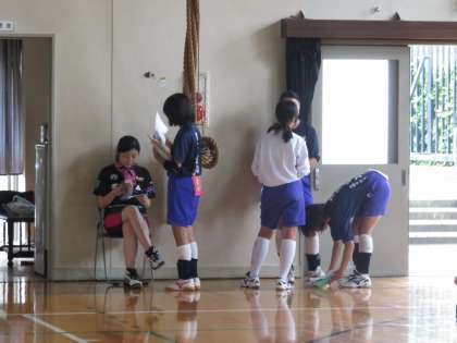 女子バレー部も停電のため,薄暗い体育館でをーミングアップの最中です。顧問の先生は部員の夏休みの宿題を点検中。提出が終わった人から練習に参加していきます。