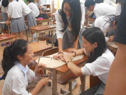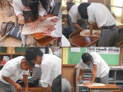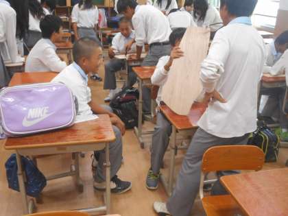 2年生は,1年生と一緒に交通安全の「飛び出し坊や」の山科中学版飛び出し坊や〜デザインは美術部が考えてくれた,ウサギとカメを使ったものです〜