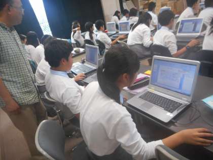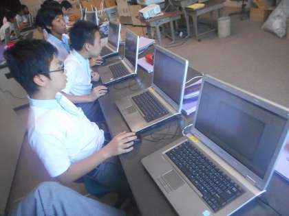 2年4組の技術の時間。今日は「パワーポイント」というソフトを使って,プレゼンテーション作成の練習をしています。