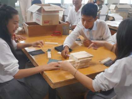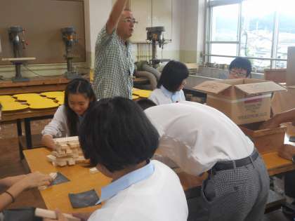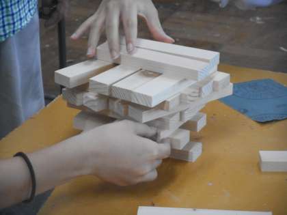 8組では余った材木を利用して,「ジェンガ」を作っています。どれだけ高く積めるかな?