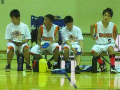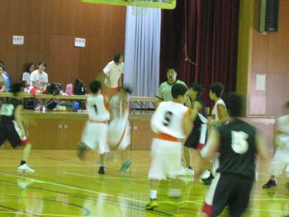 男子バスケット部も予選リーグで,今日は産大付属中学との対戦です。大きくリードを奪い,後半は1年生もたくさん出場していました。