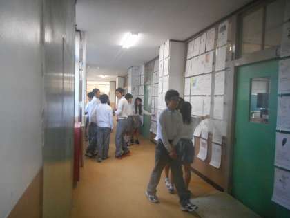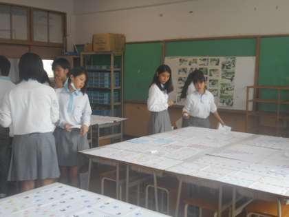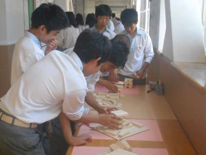 展示鑑賞中のようすです。8組のジェンガーでは男子が楽しく遊んでいます。