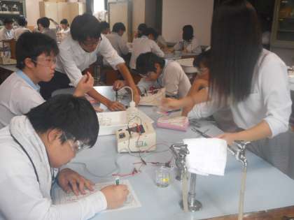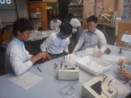 実験では電極を繋いで,どのような水溶液が電気を通しやすいか調べています。