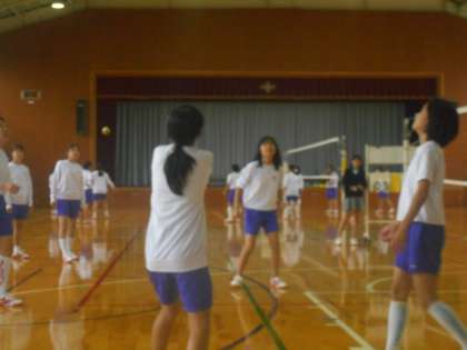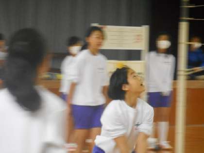1・2組の女子は体育館でバレーボールです。体育館は明るさが足りないのでどうしても写真がぼやっとしてしまいます。1年生では床にワンバウンドしてもOKのルールなので,けっこいラリーが続きます。お互いに声もよく掛け合って白熱したプレーになっていました。