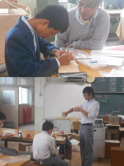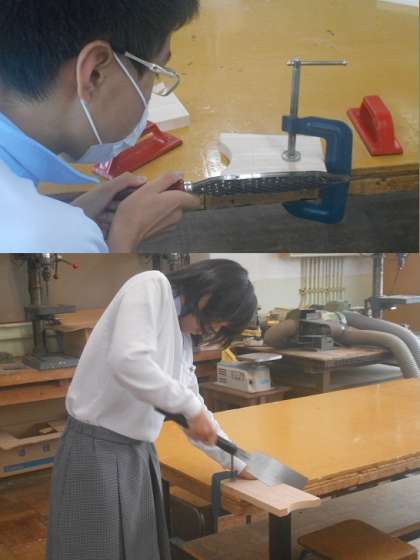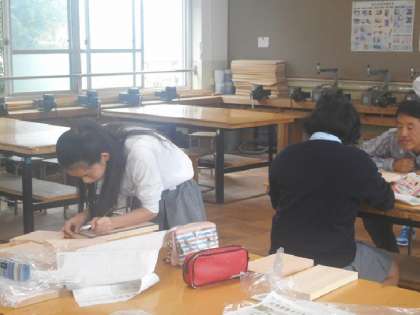 8組は技術の時間,木工で風呂場の「腰掛け」を作っています。