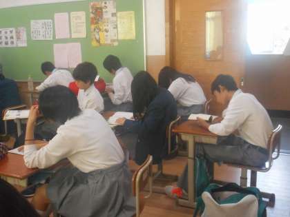 2年4組の朝のようすです。担任の先生は熱心に本を読んでおられますが,中には宿題をしている人もチラホラ・・・